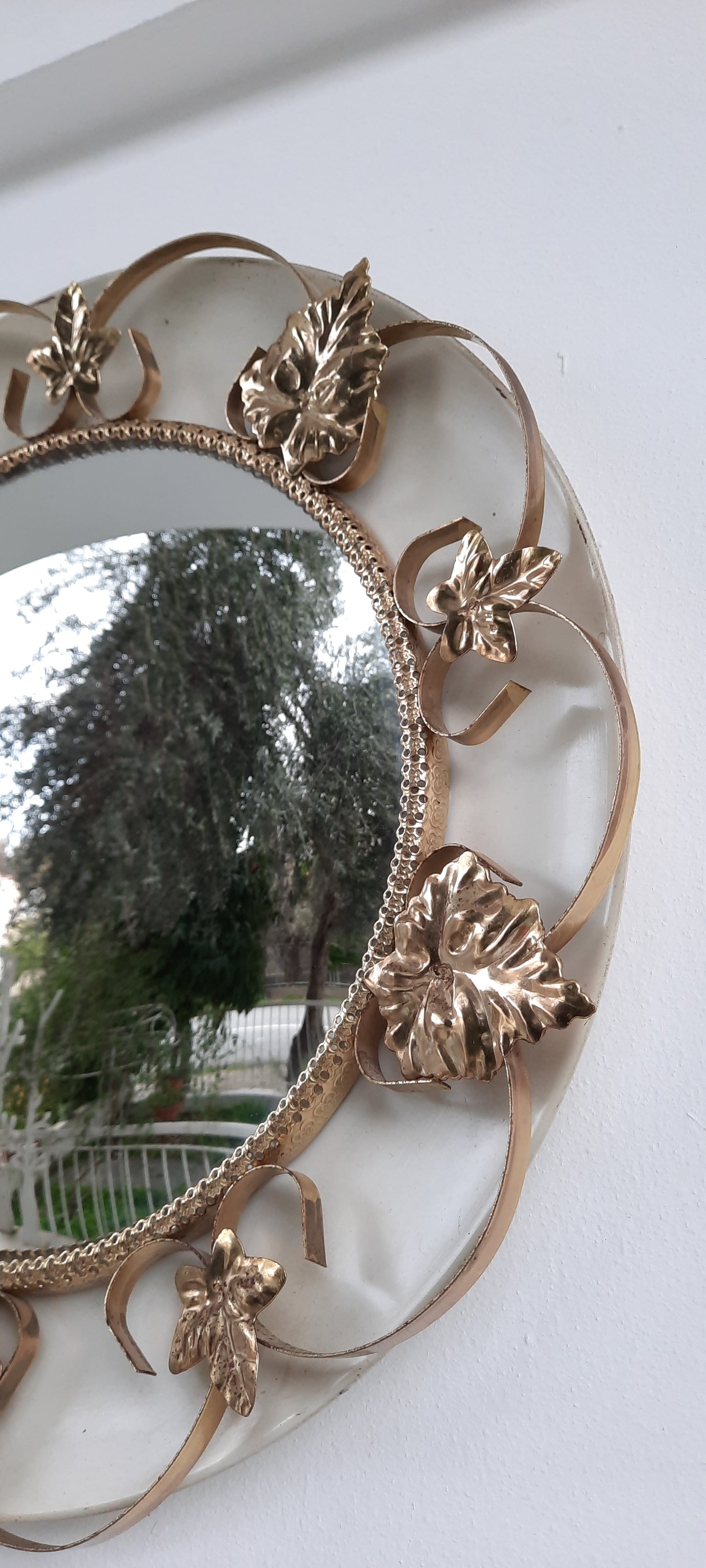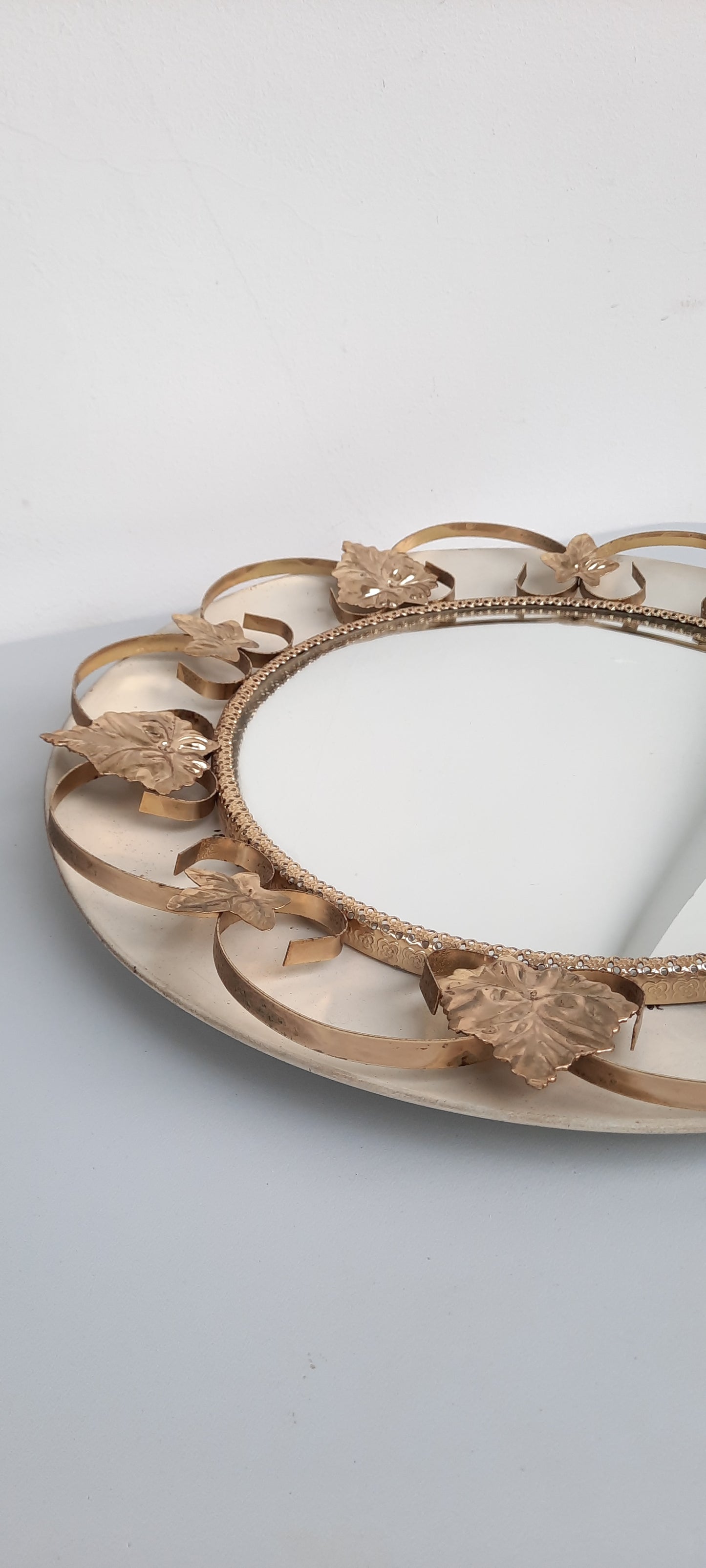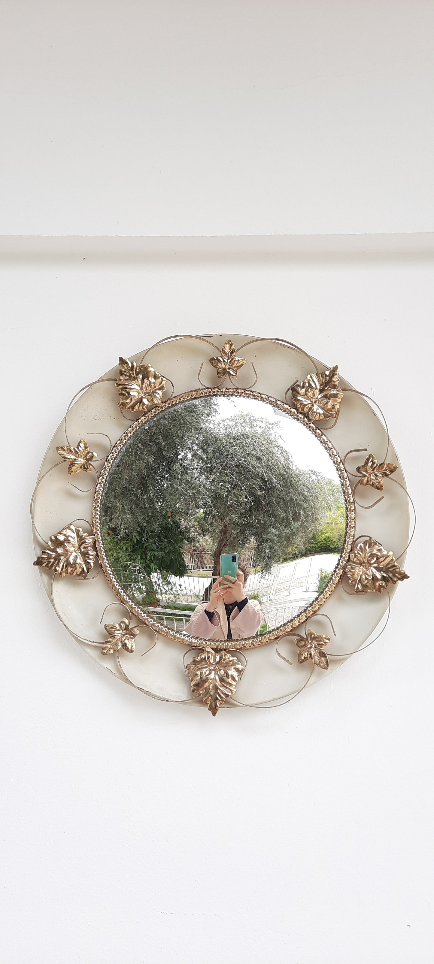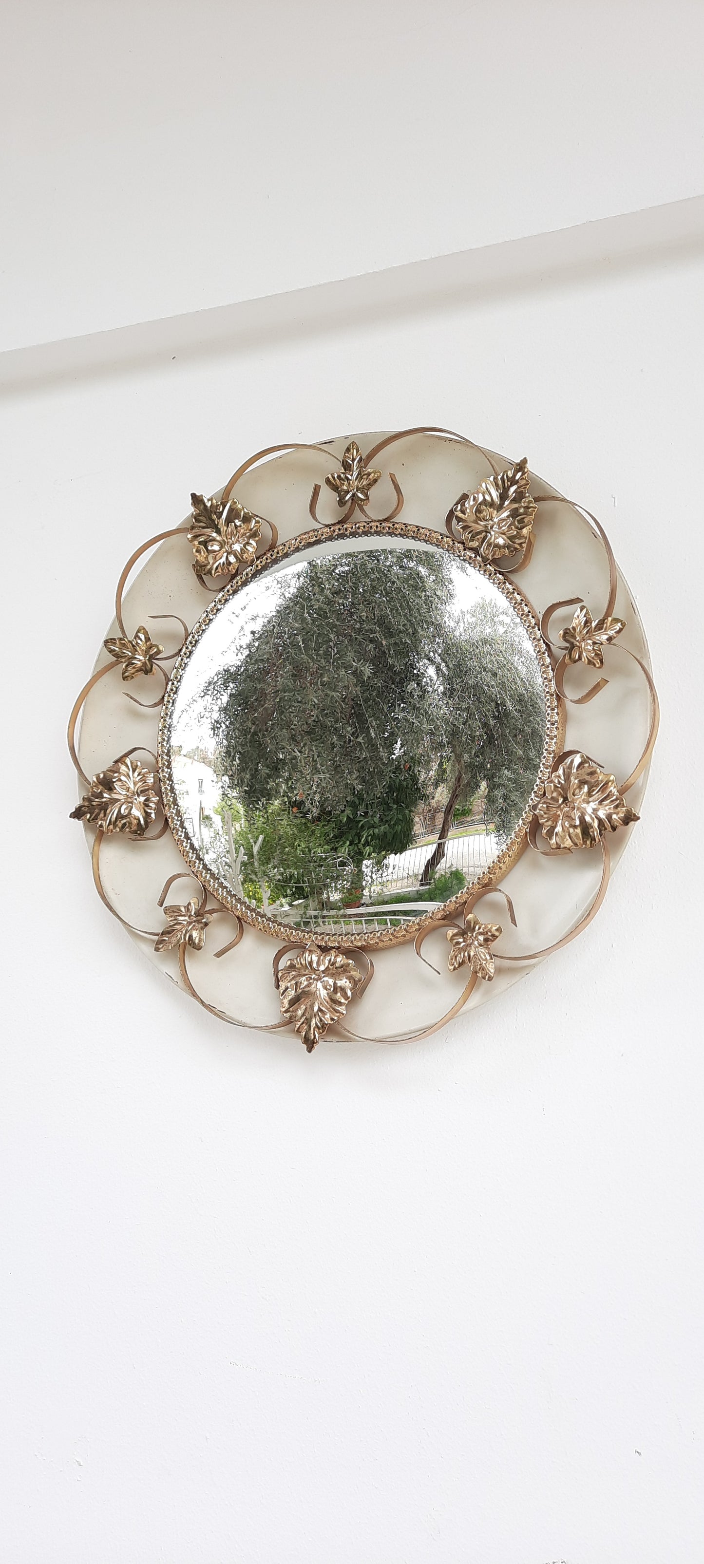 Beautiful mid-century round wall mirror, featuring a brass leaf design all around the convex mirror.
