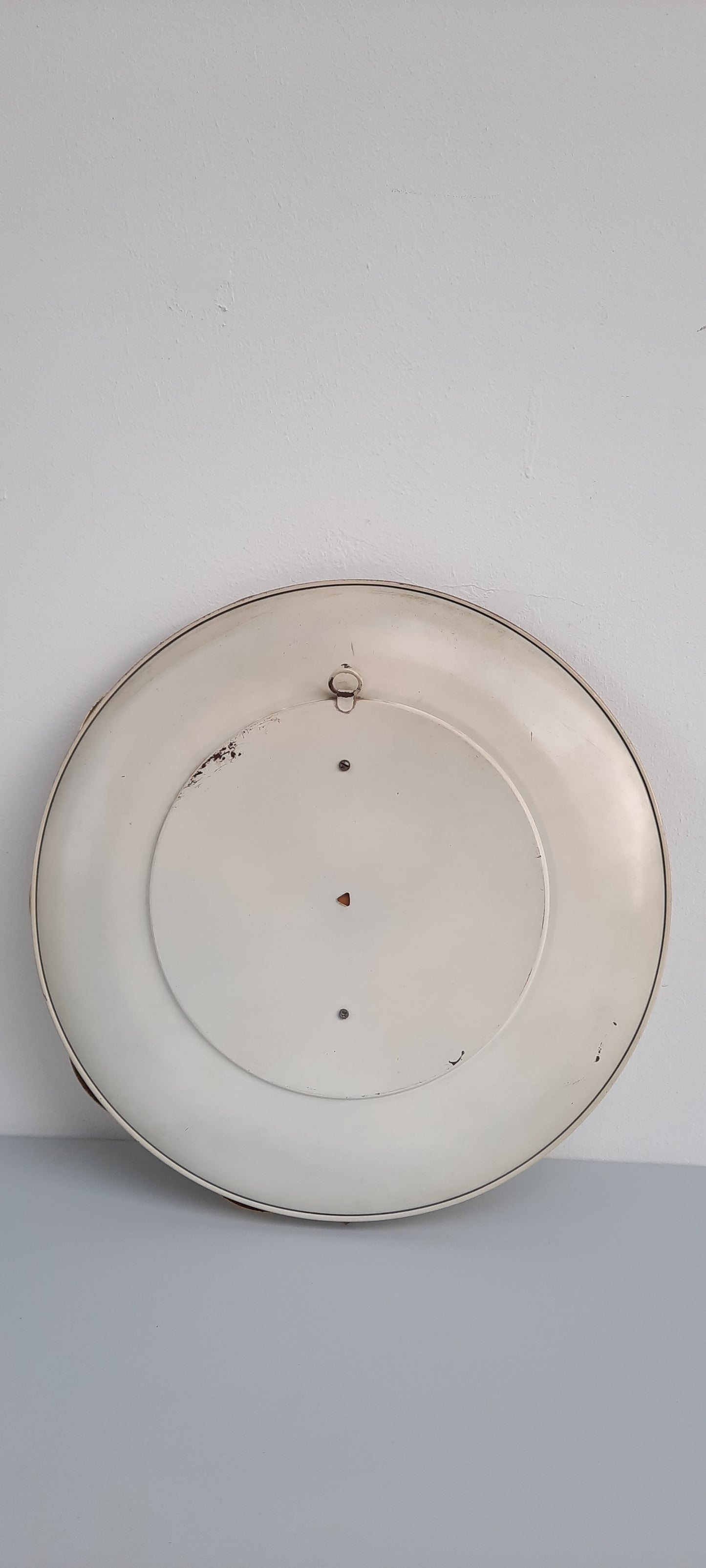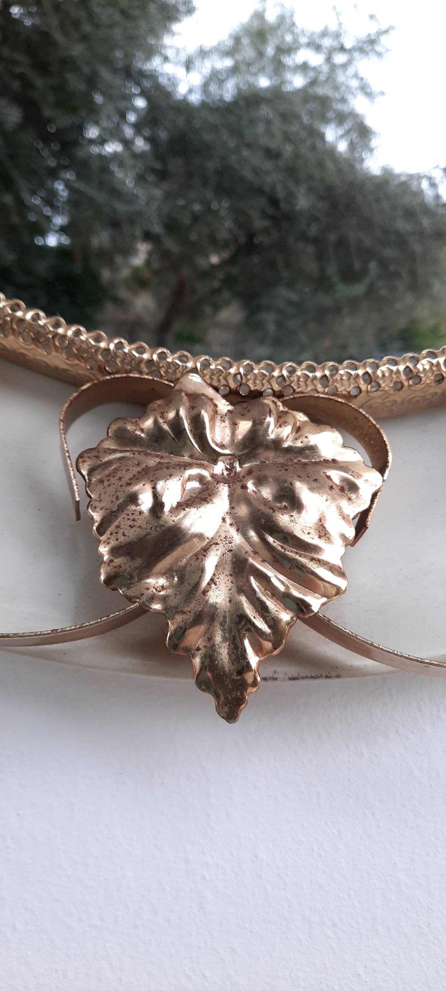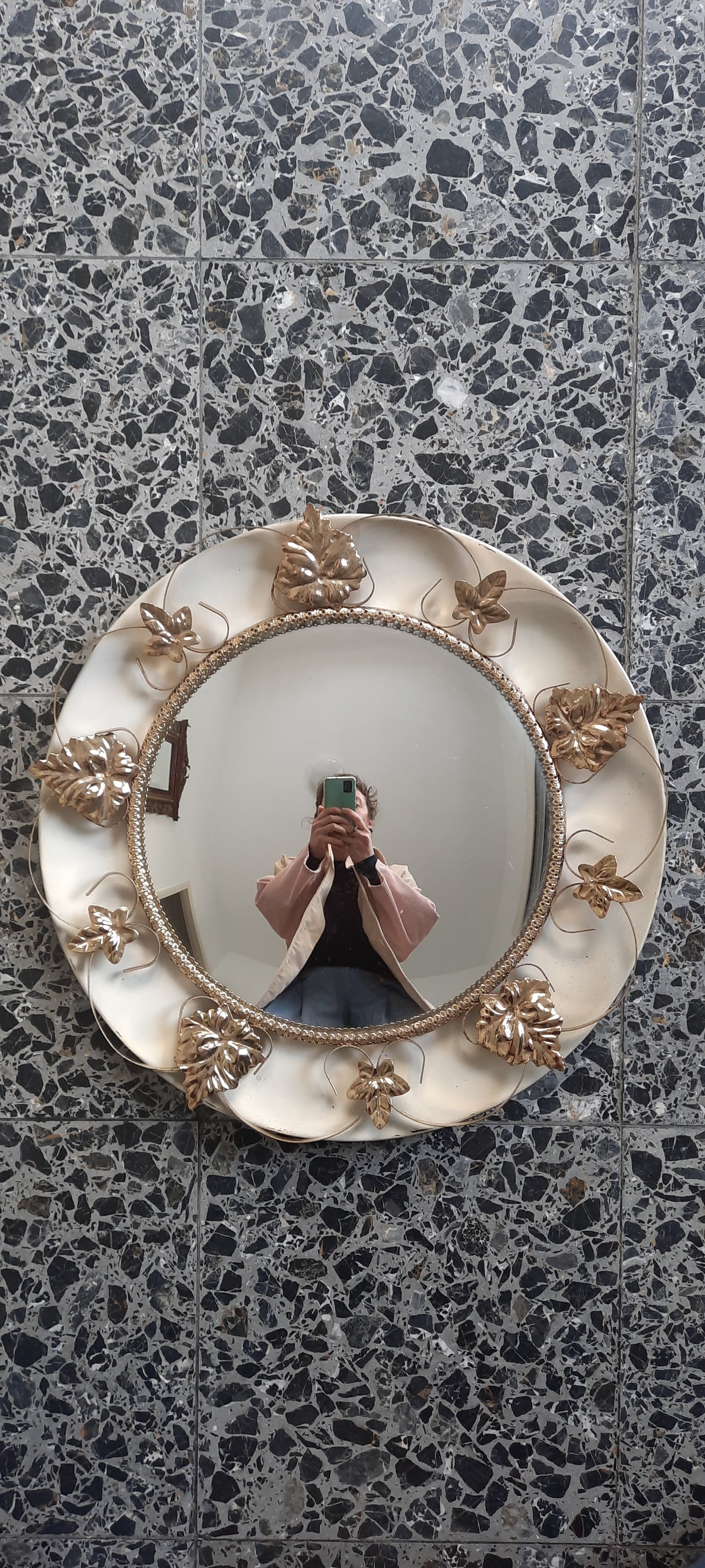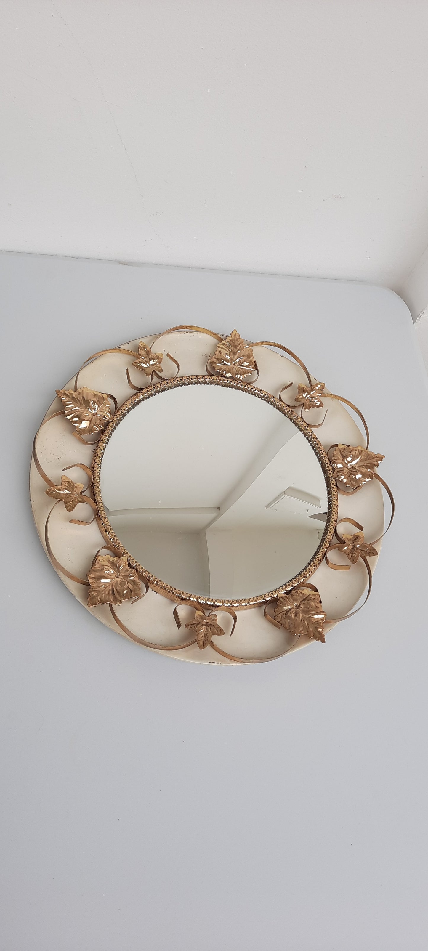 Beautiful mid-century round wall mirror, featuring a brass leaf design all around the convex mirror.