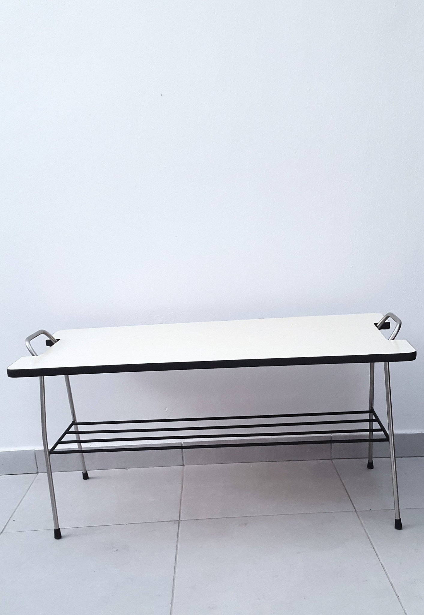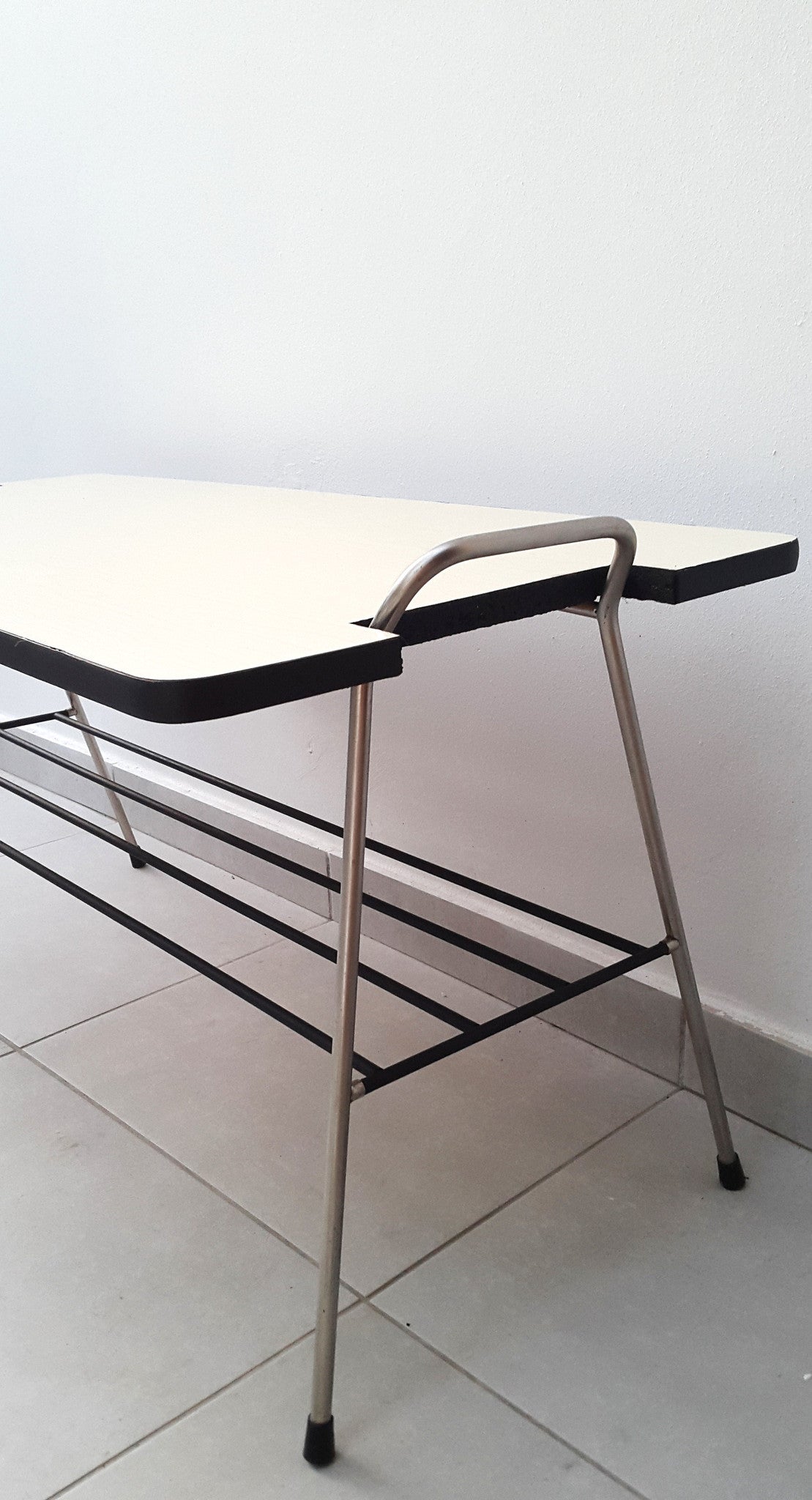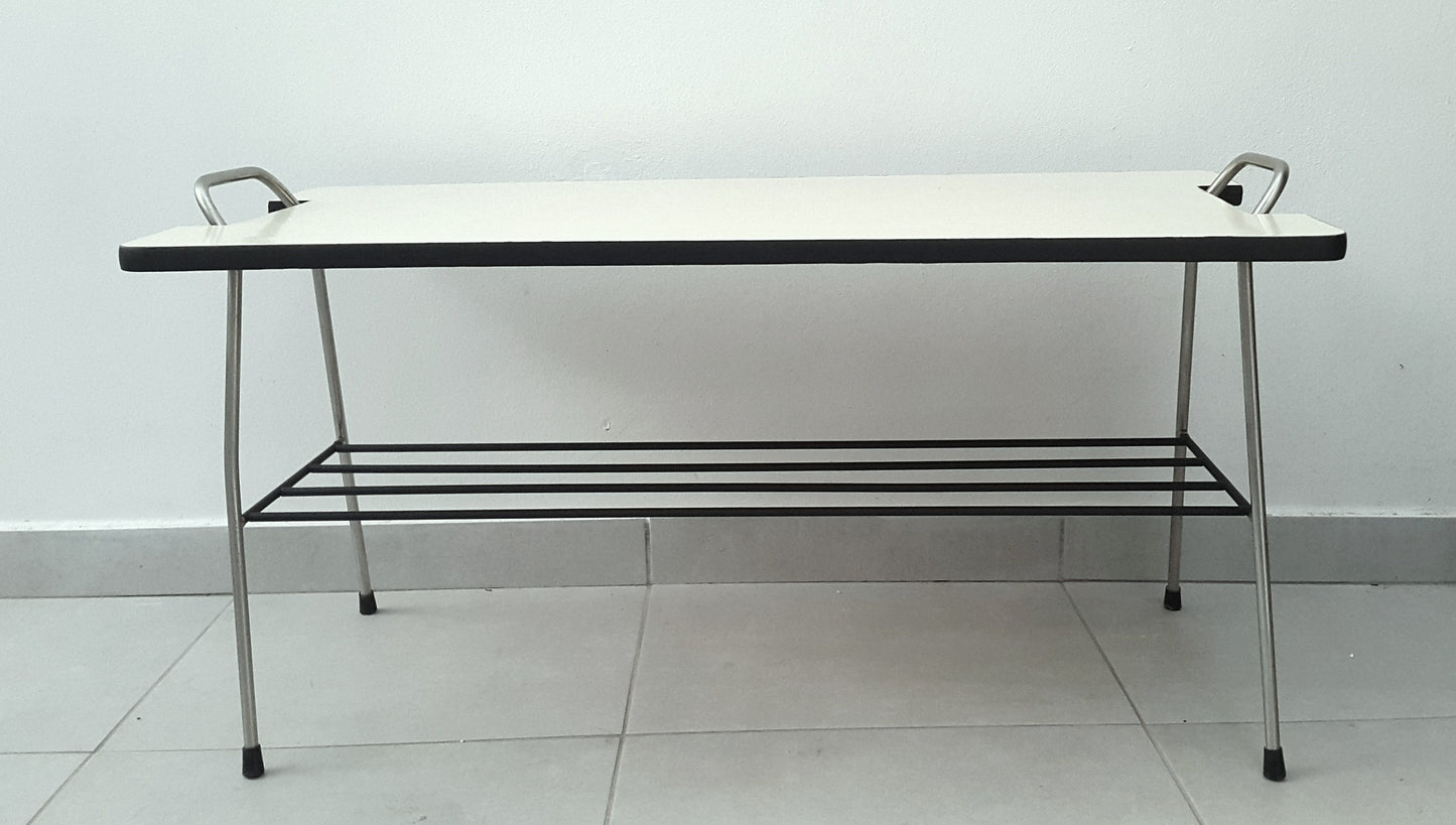 This mid-century coffee table features a magazine rack underneath and cool side handles that make it easy to pick up and move around (it is very light) and also give it a unique 'tray' look. The design of this table is so awesome that we decided to leave its original look and just freshen up the rusty metal on the legs (as you can see from the last 'before' photo) and give it a lick of paint around the edges.