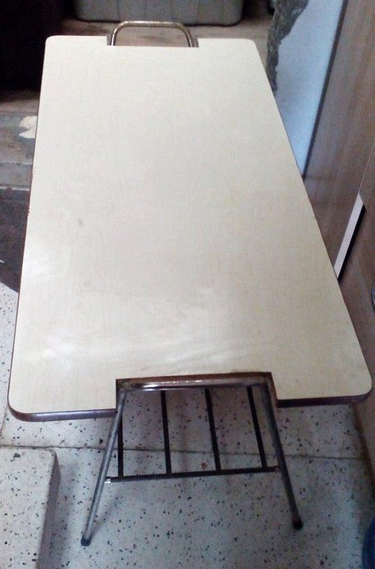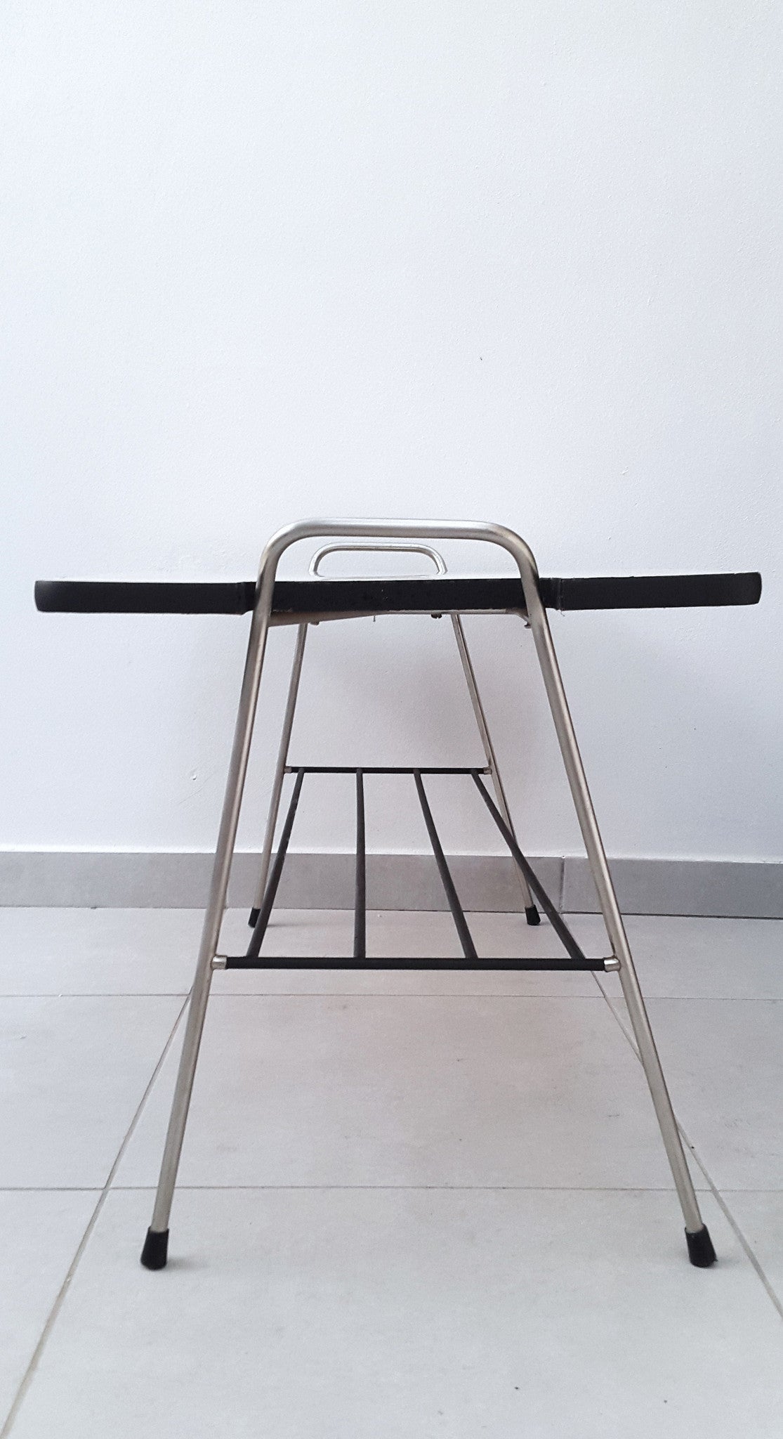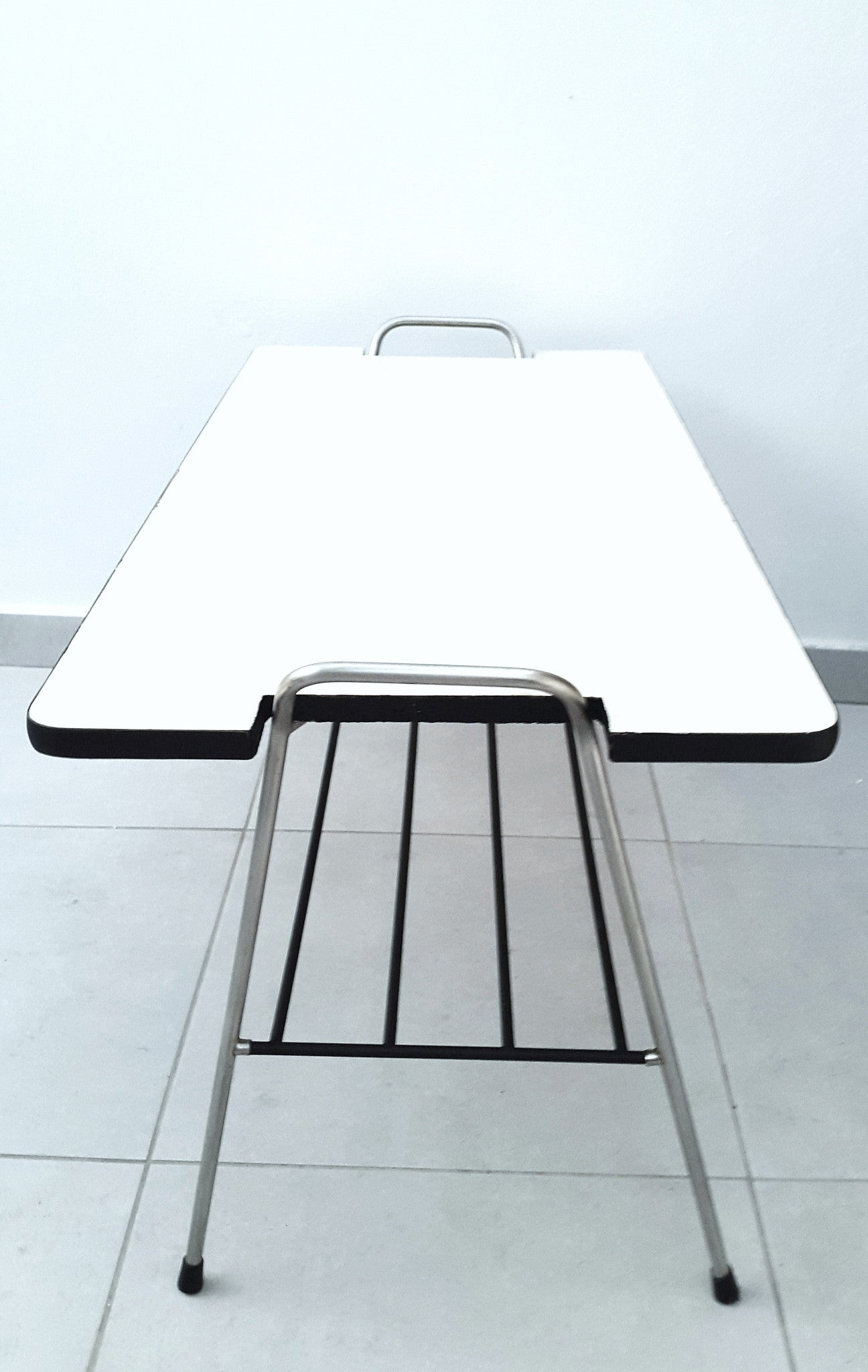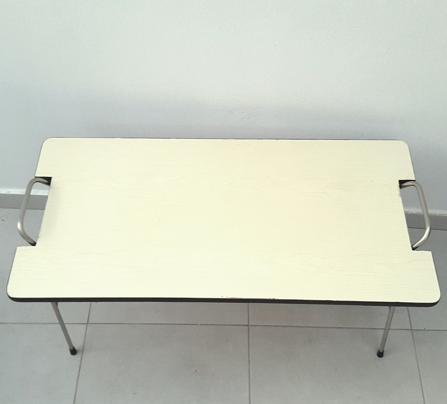 This mid-century coffee table features a magazine rack underneath and cool side handles that make it easy to pick up and move around (it is very light) and also give it a unique 'tray' look. The design of this table is so awesome that we decided to leave its original look and just freshen up the rusty metal on the legs (as you can see from the last 'before' photo) and give it a lick of paint around the edges.