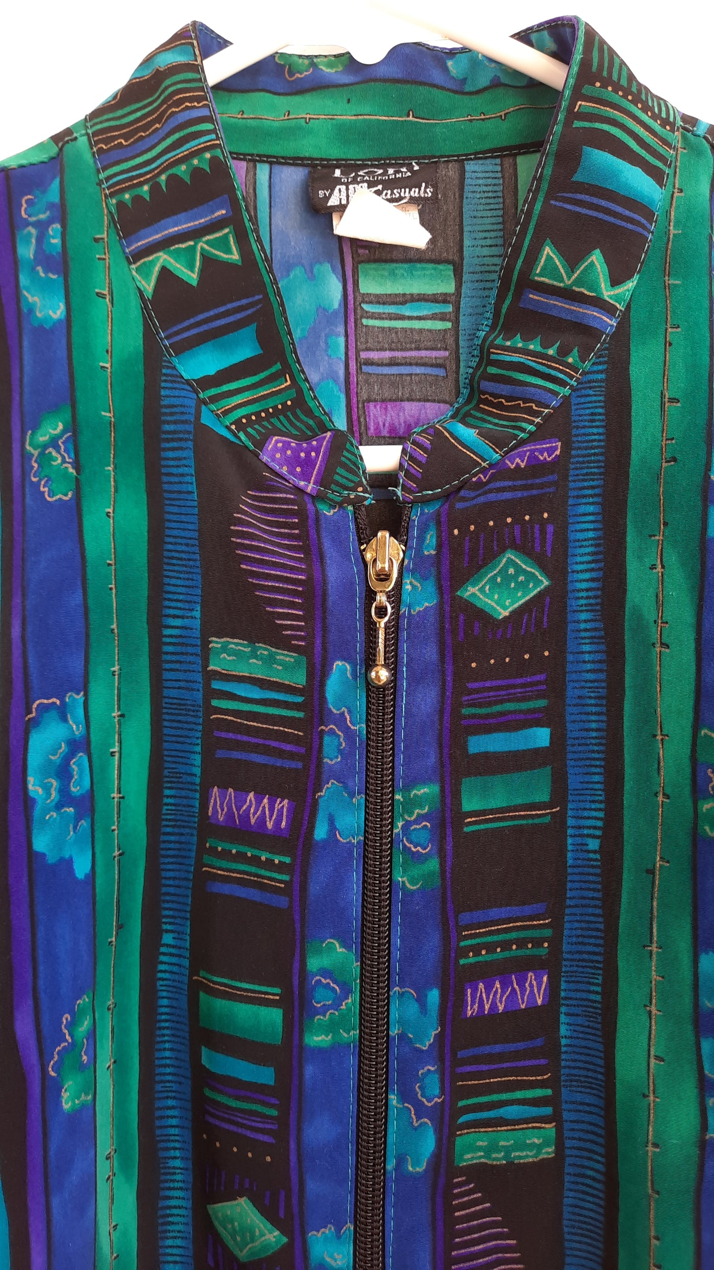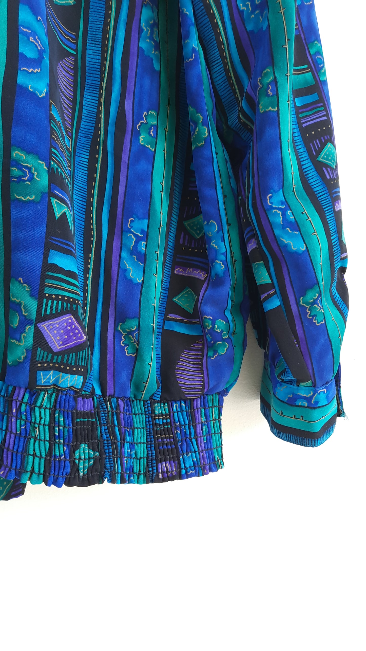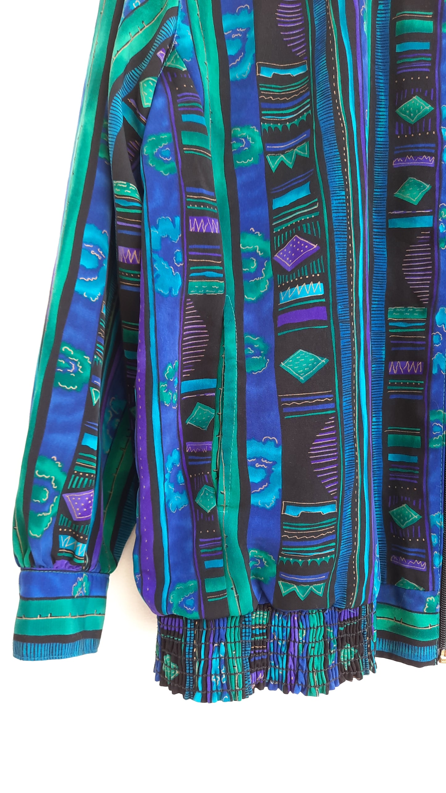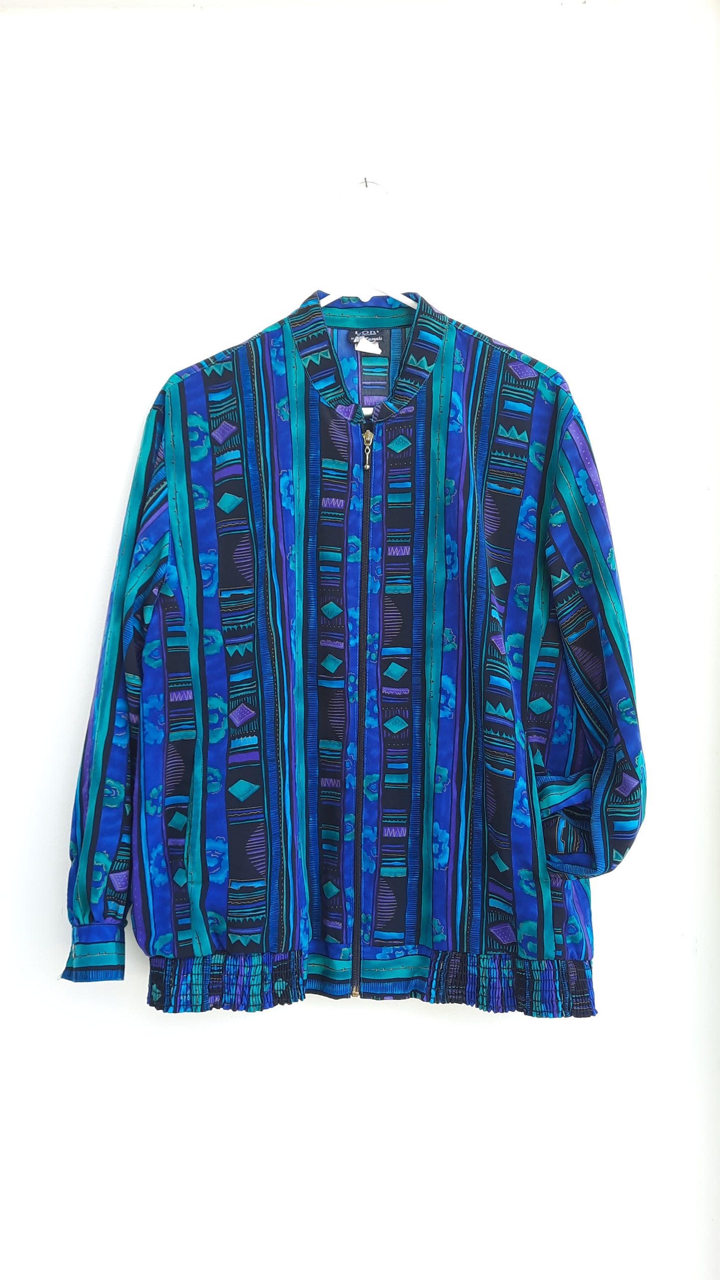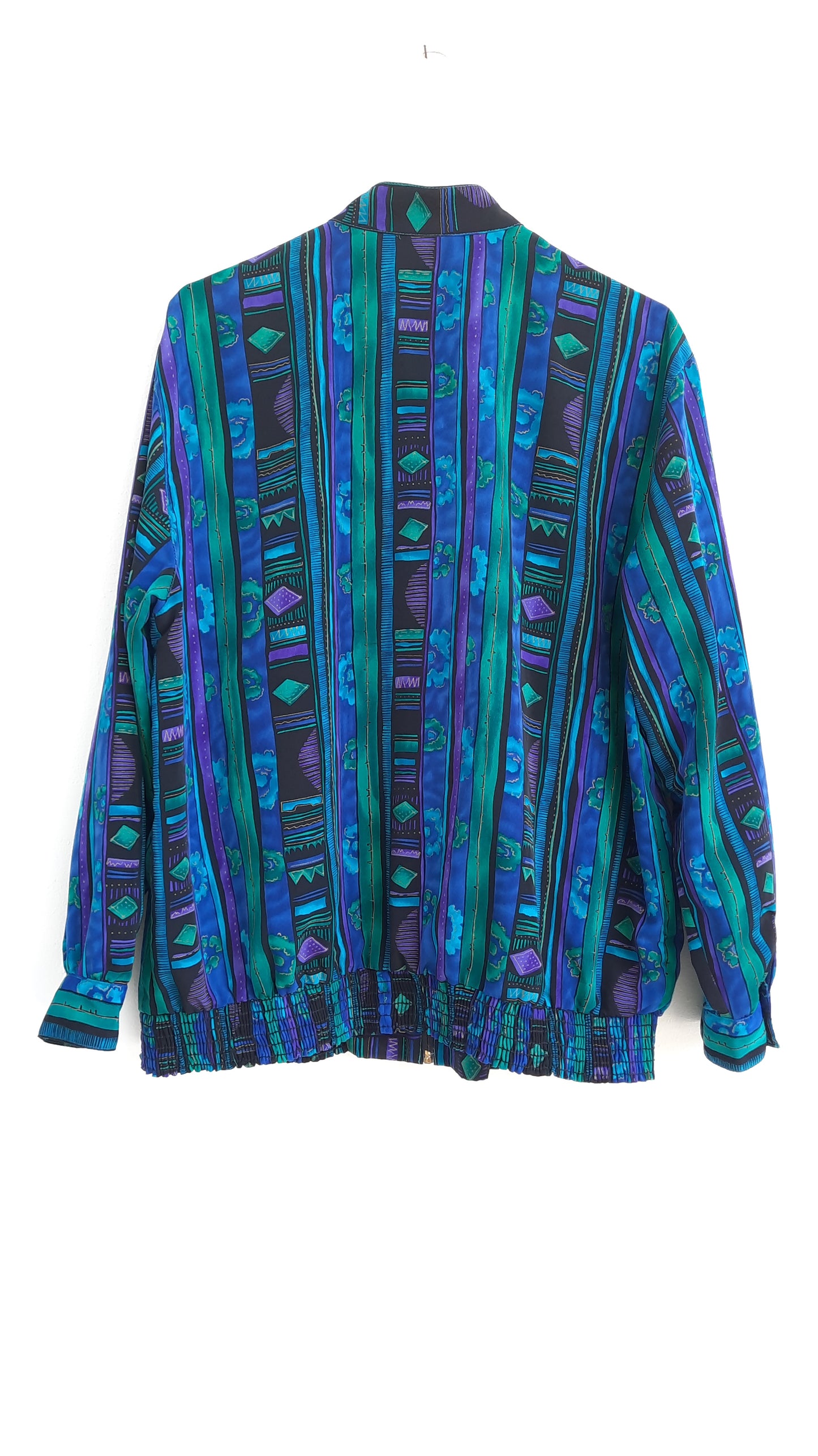 Fantastic vintage lightweight bomber jacket in this amazing purple and green 80s print. Super easy unisex transitional jacket to take you from autumn to winter. Roll up those sleeves for more laid back cool vibes!