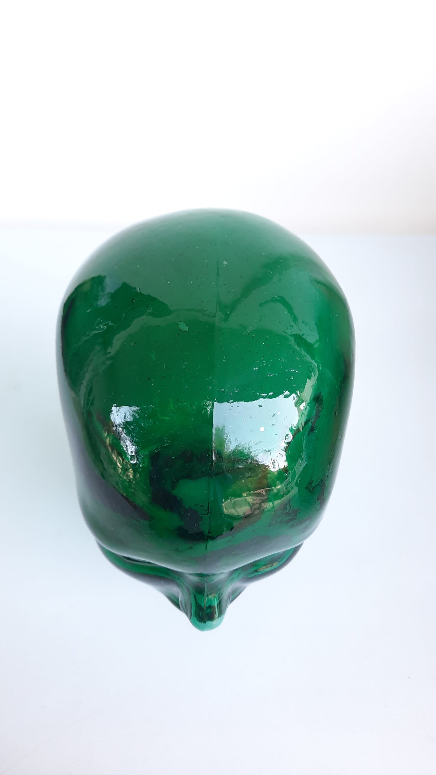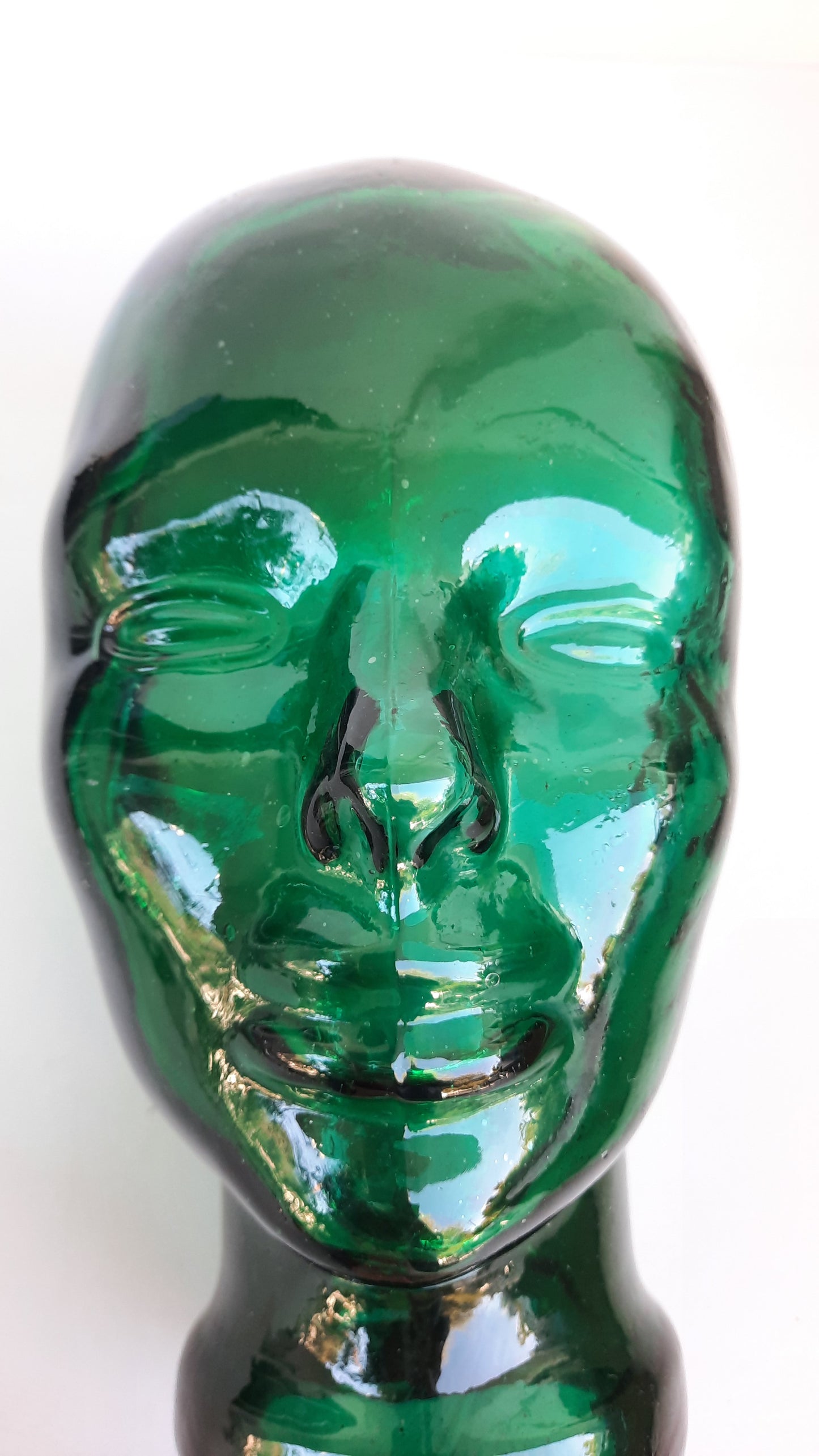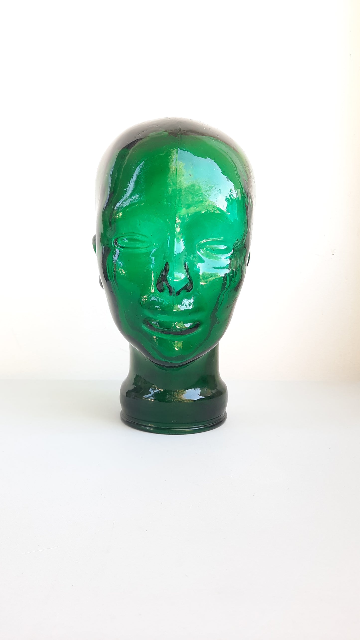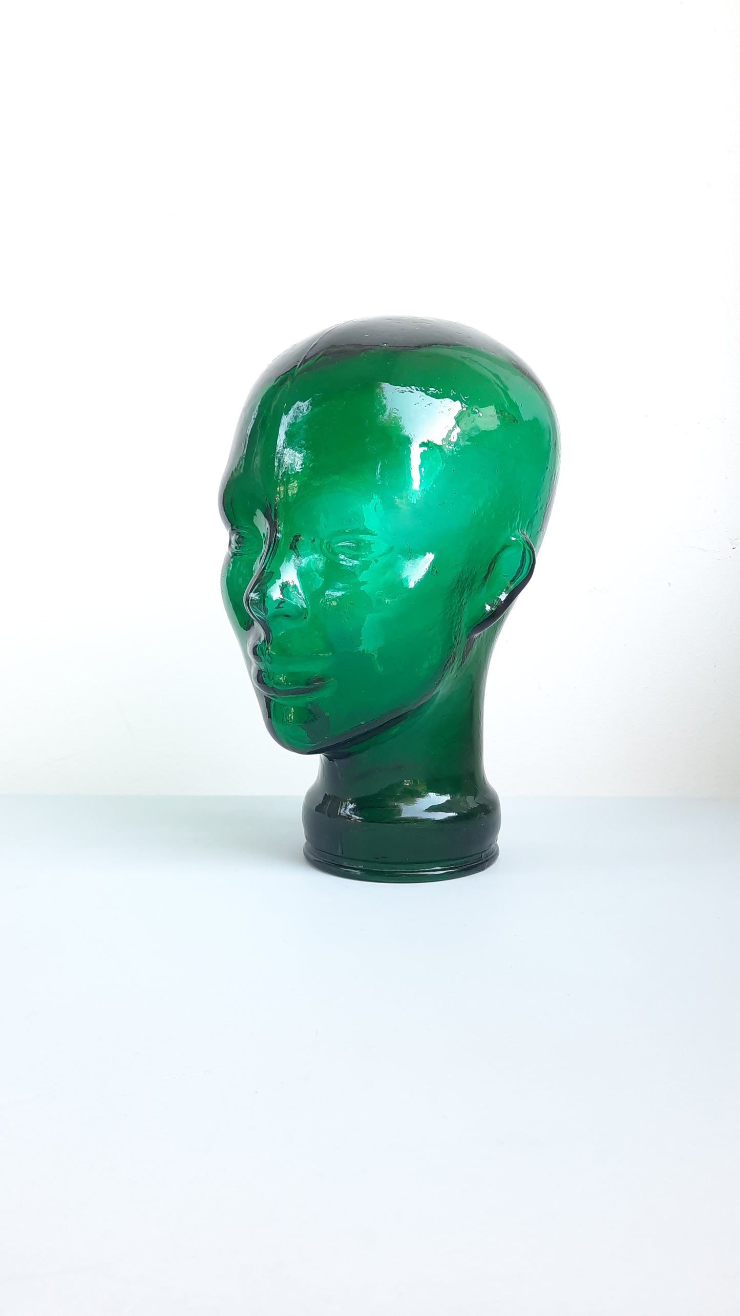 Such a gorgeous and practical piece either to use or for display! Stunning emerald green hand blown glass mannequin head that can be used for so many things - hats, wigs, headphones, sunglasses, scarves or just simply a bookshelf conversation piece.