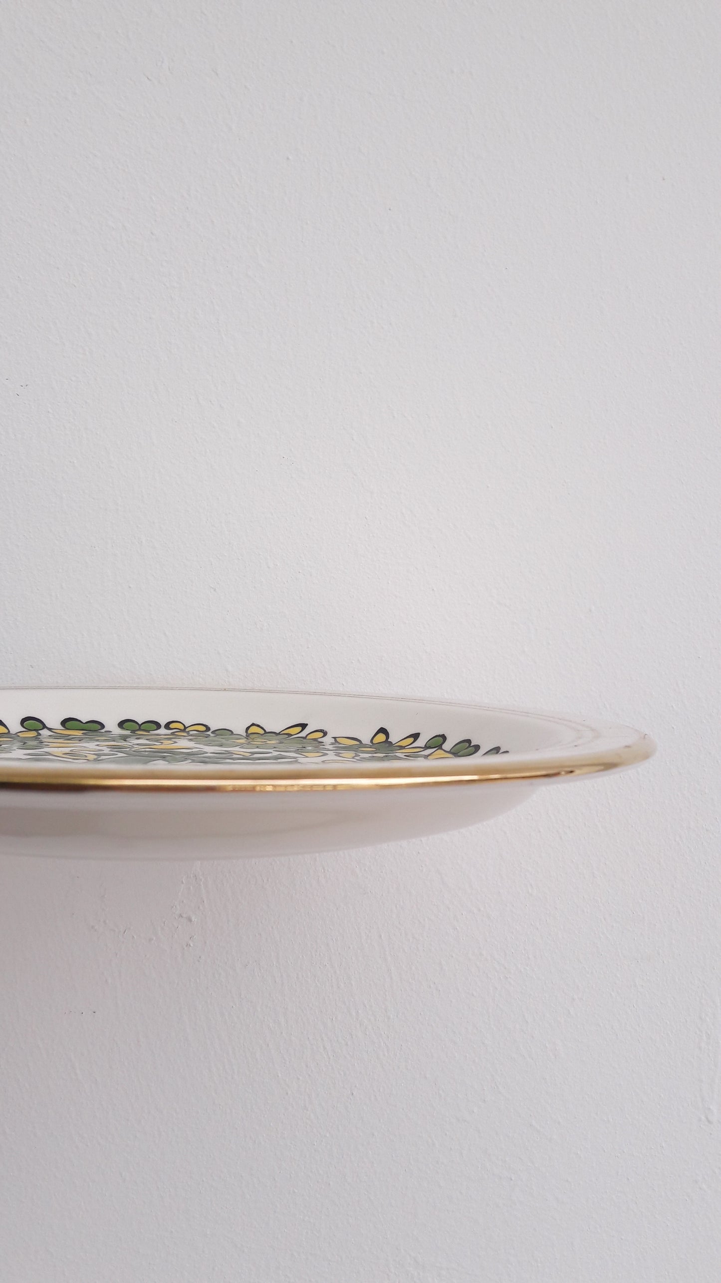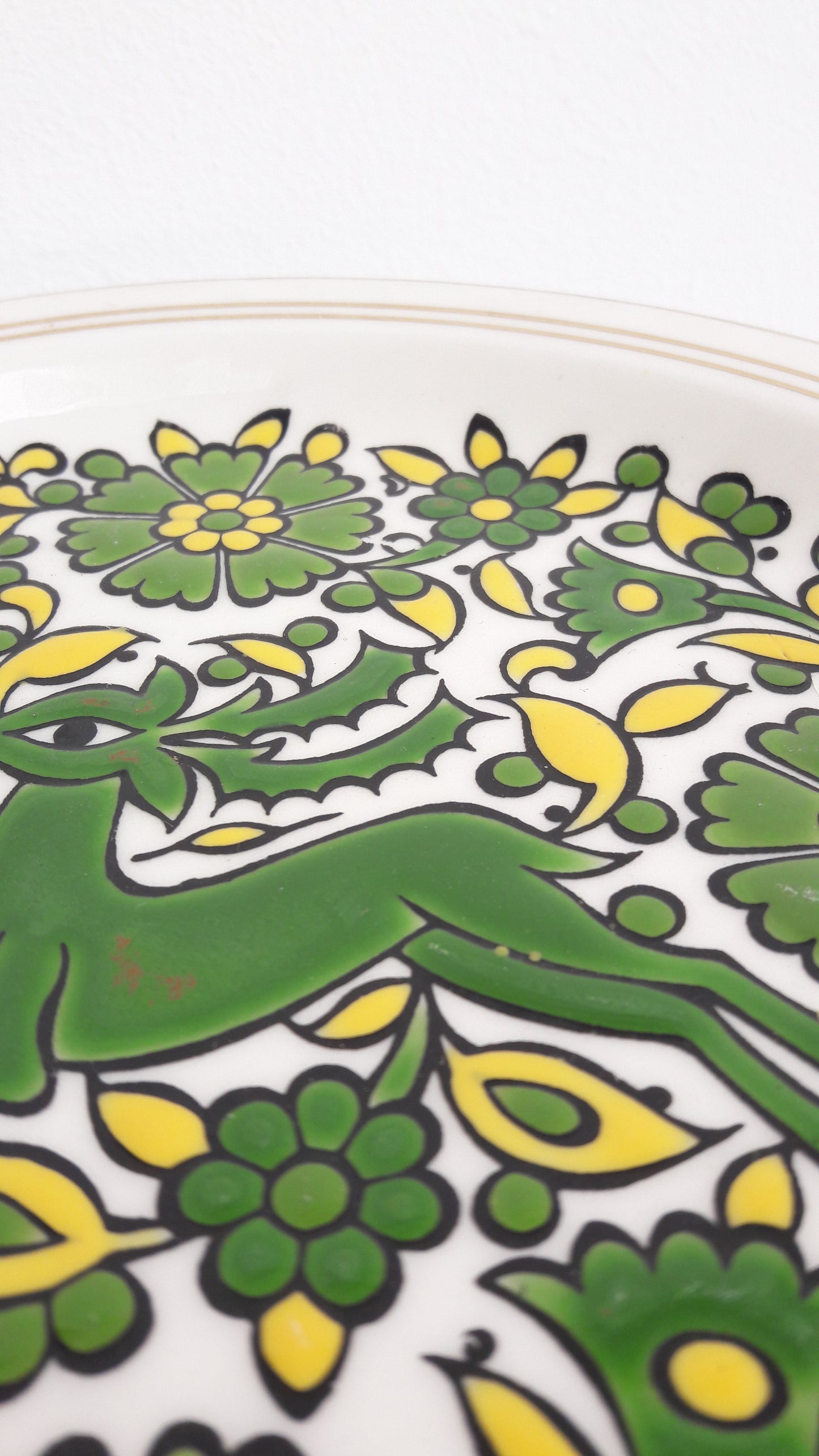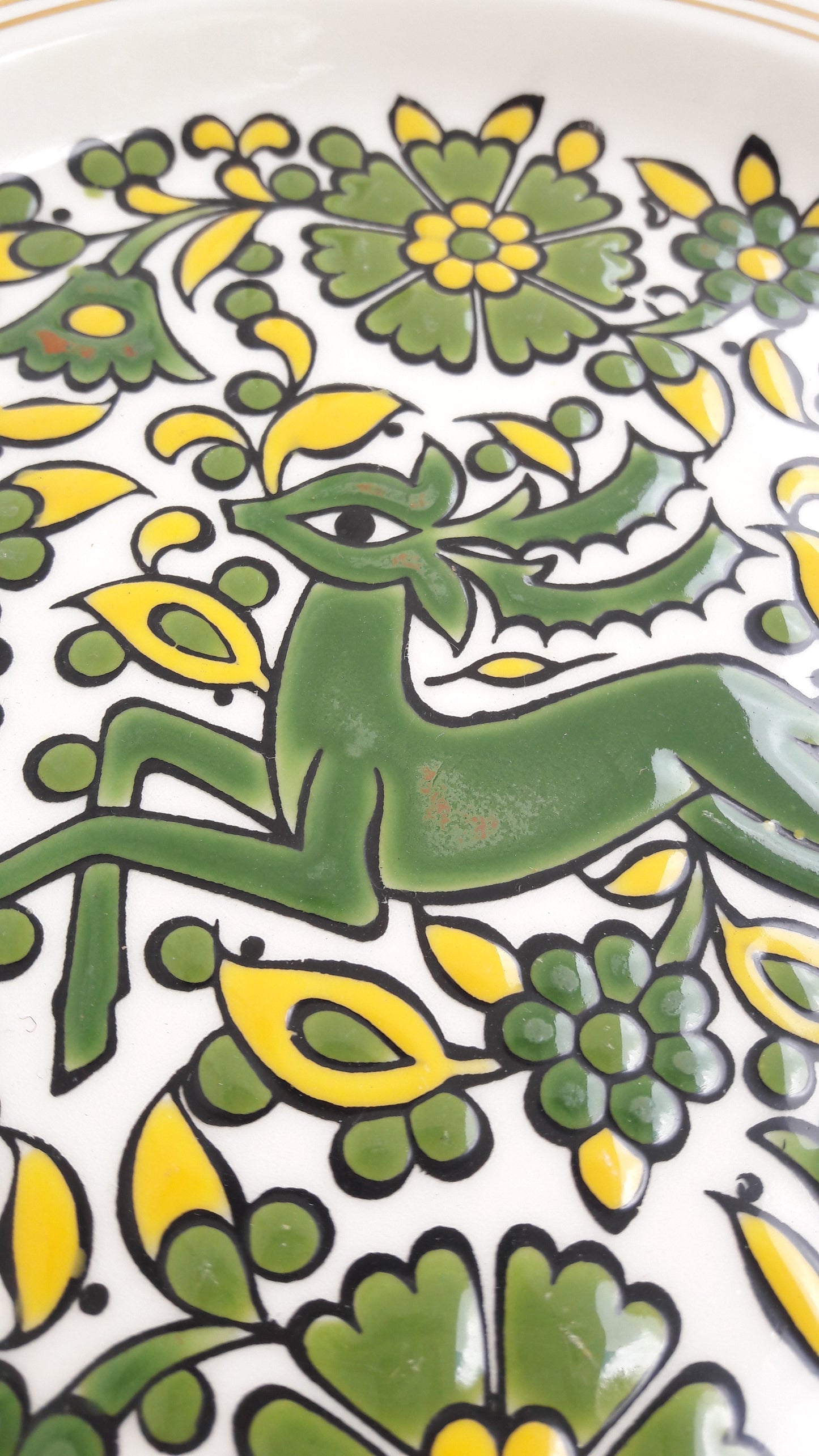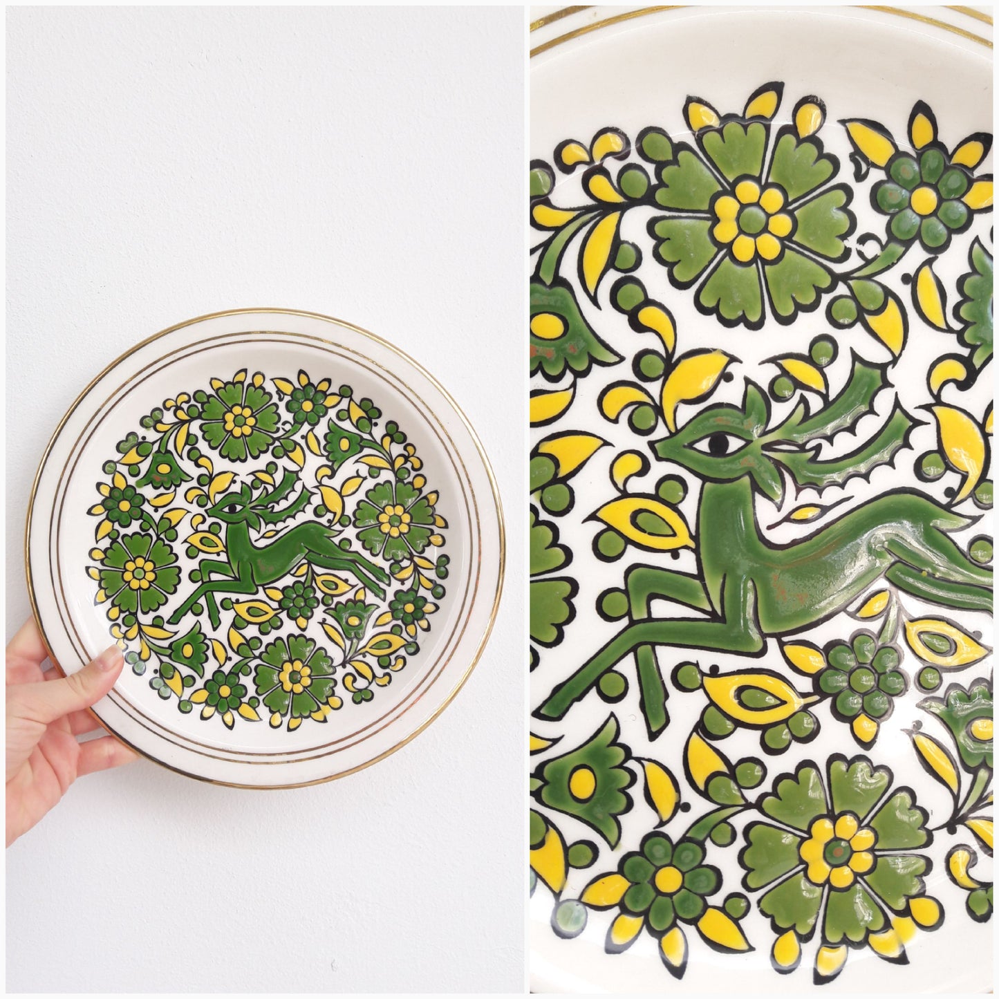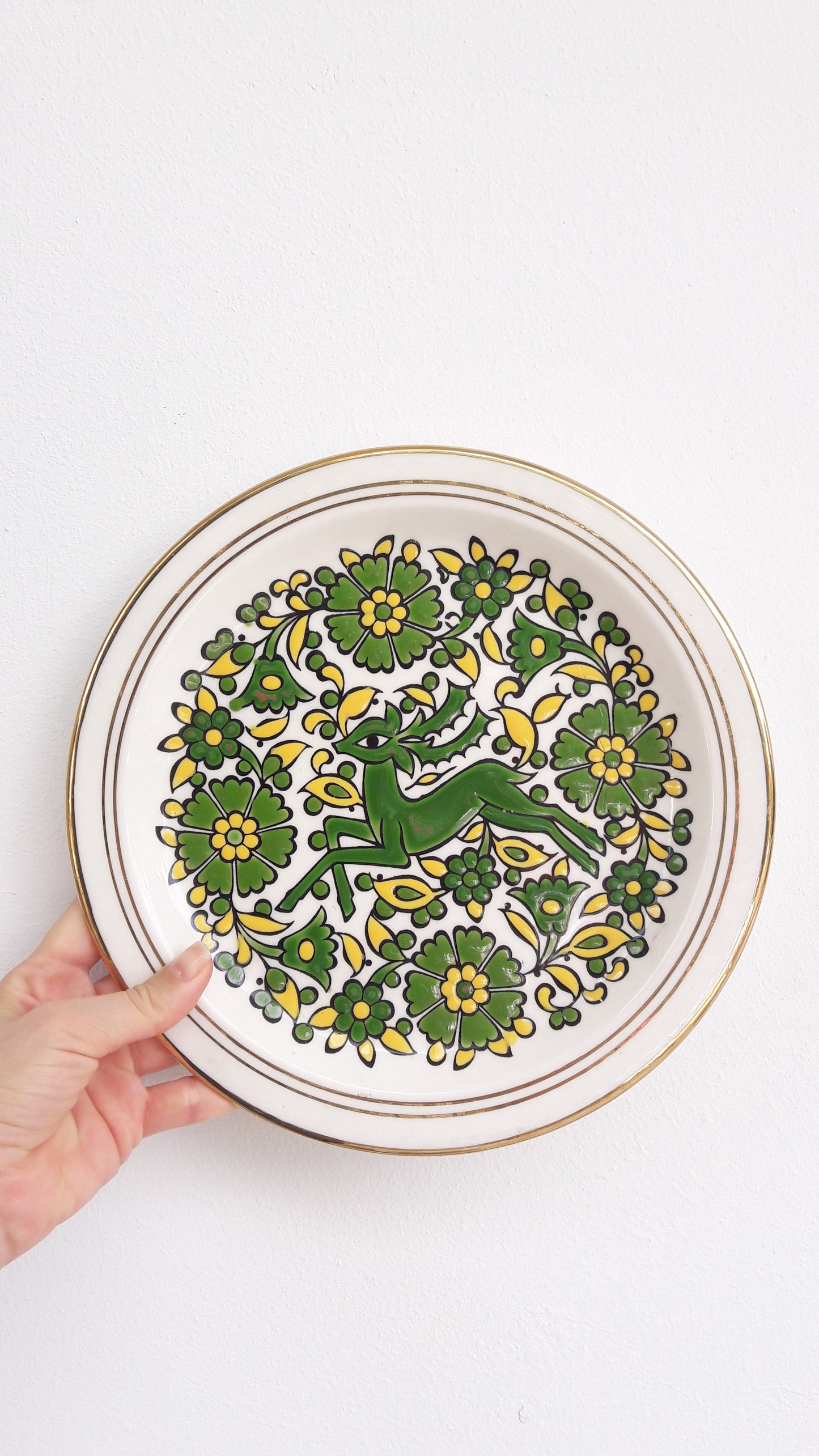Beautiful ceramic wall decor handmade by Greek company G. Takousi in Moschato, Rhodes. The slightly raised plate features a green and yellow floral design enevloping a reindeer in the middle as well as gold rims which is a very traditional Greek Hellenic retro design. Would look amazing on its own or part of a larger plate wall decor.