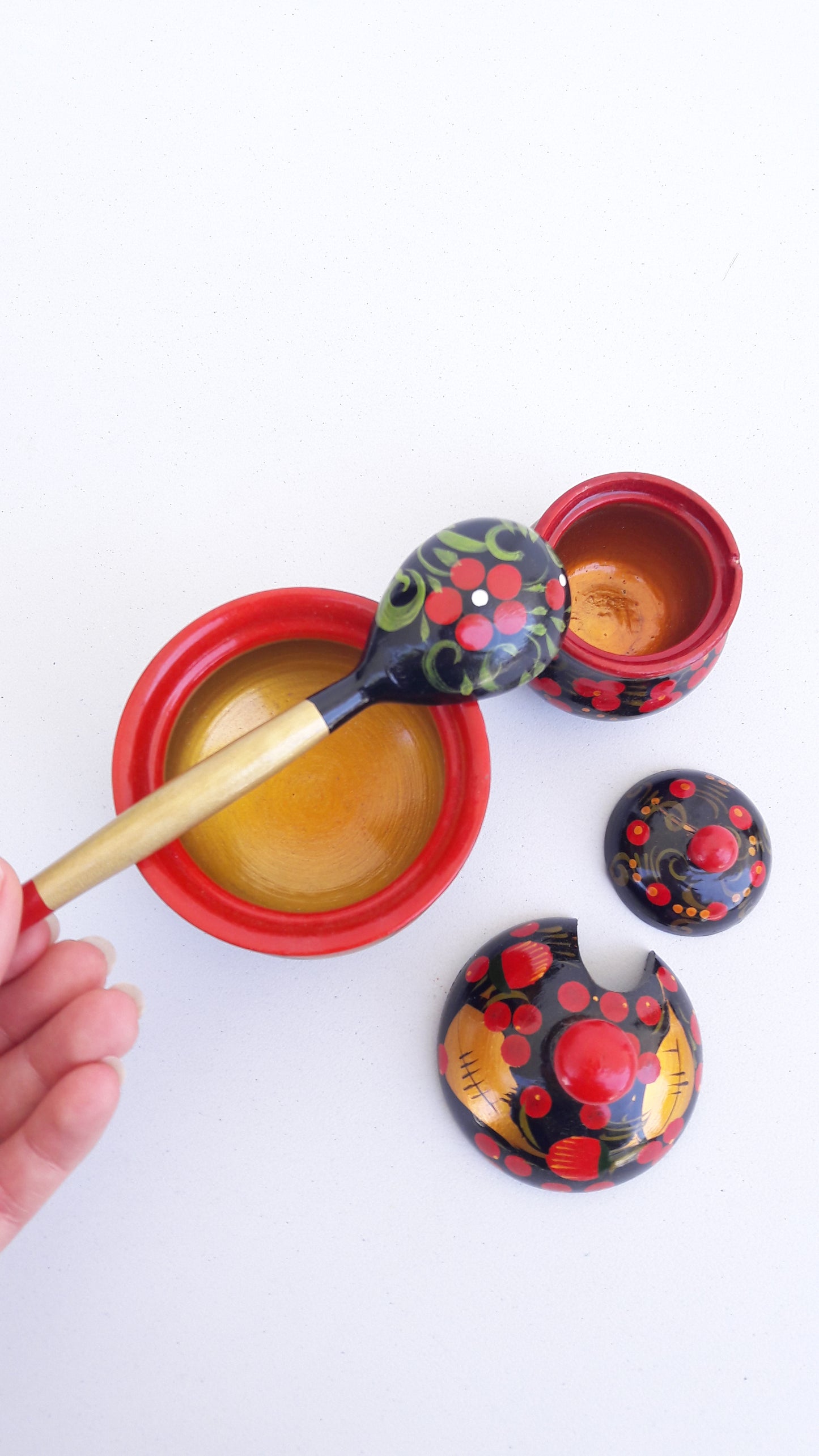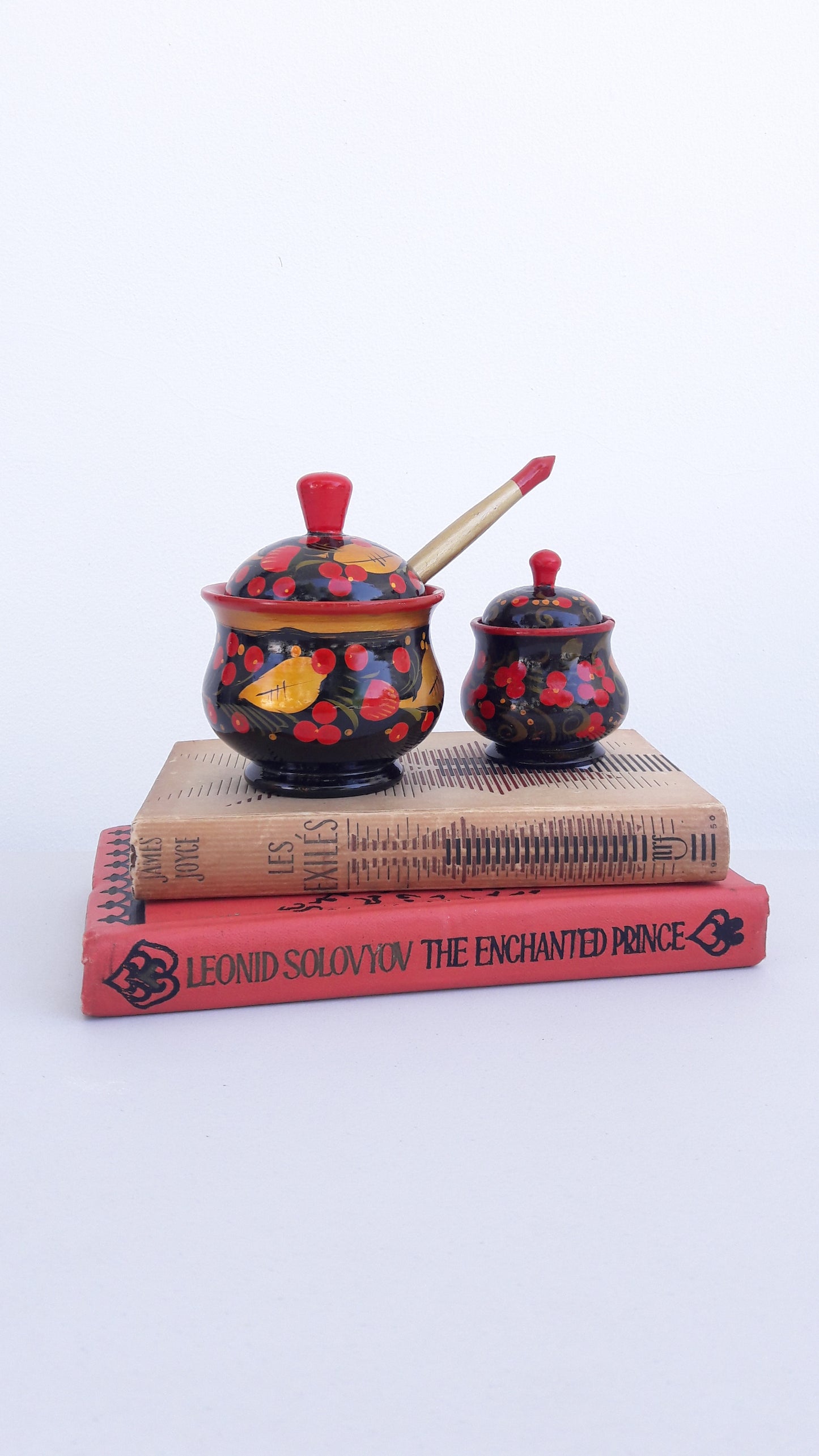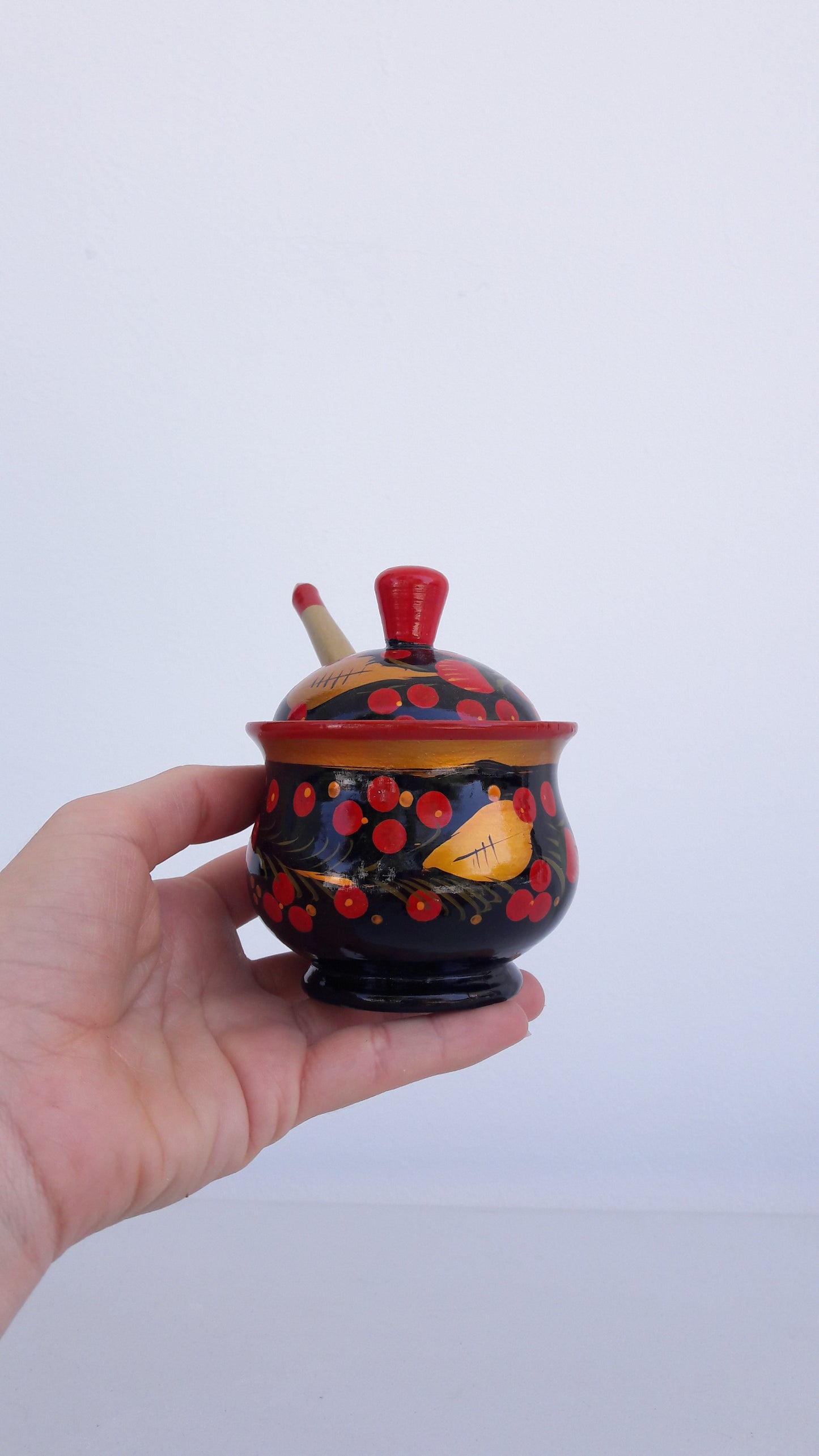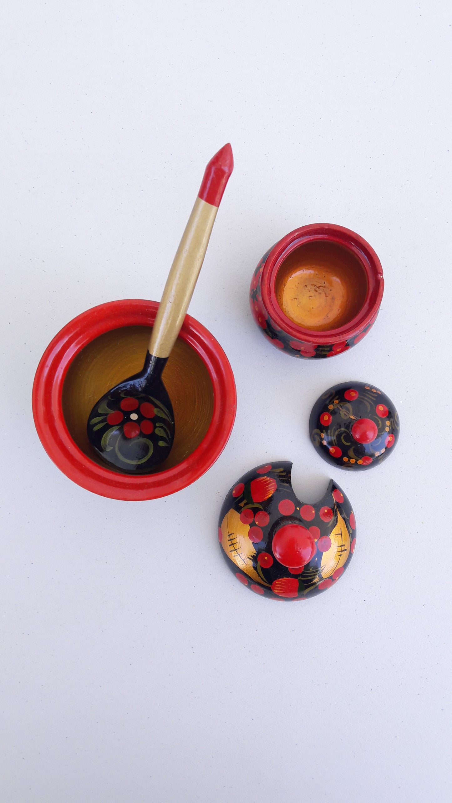 Vintage Set of Traditional Khokhloma Jars w/ Lid & Spoon
