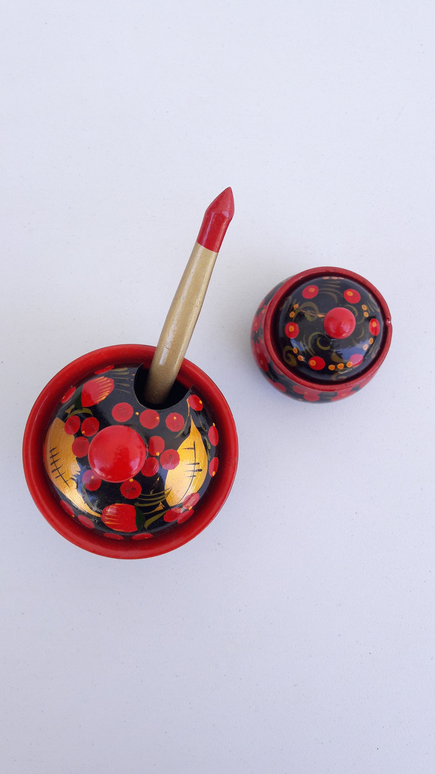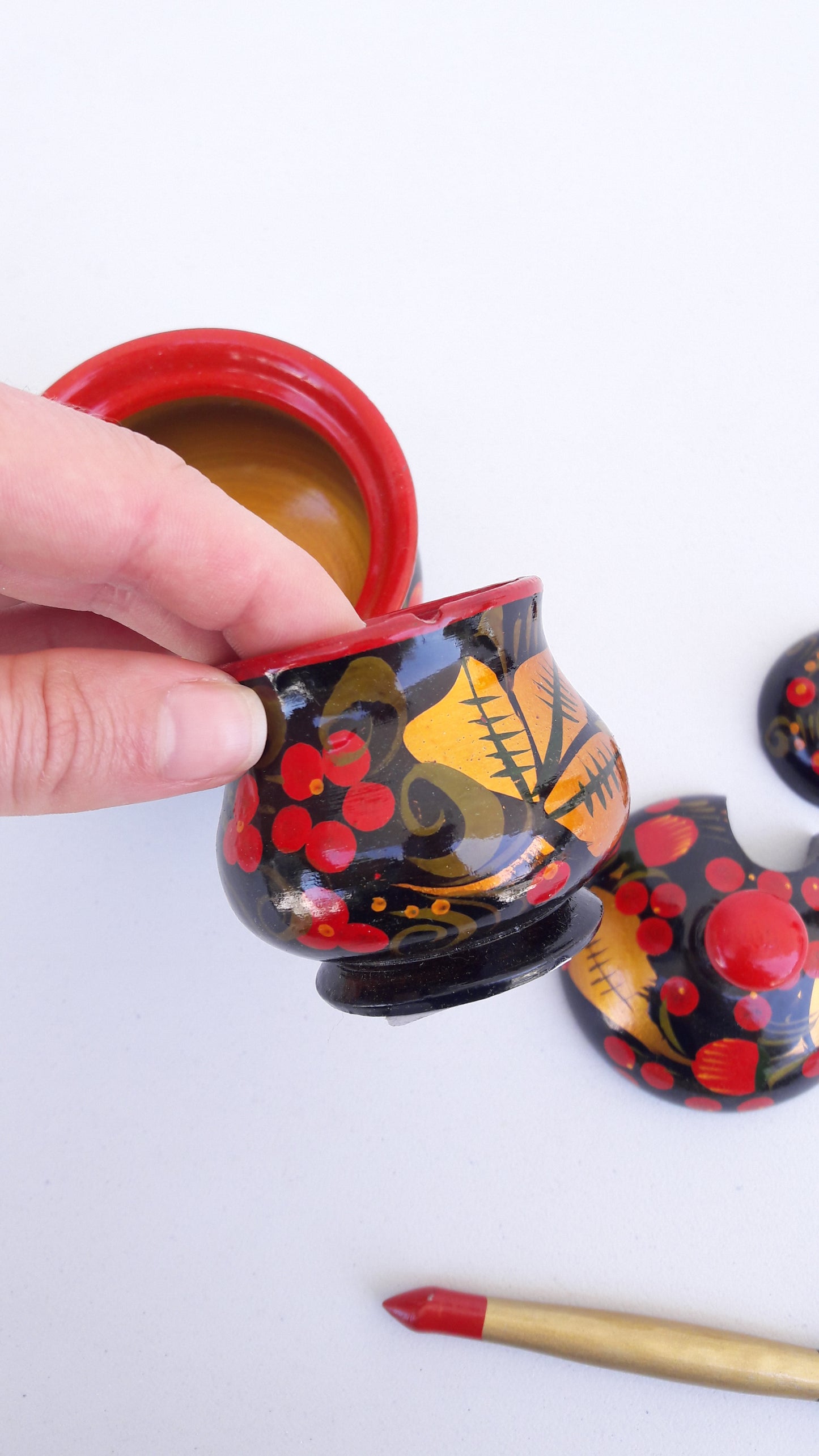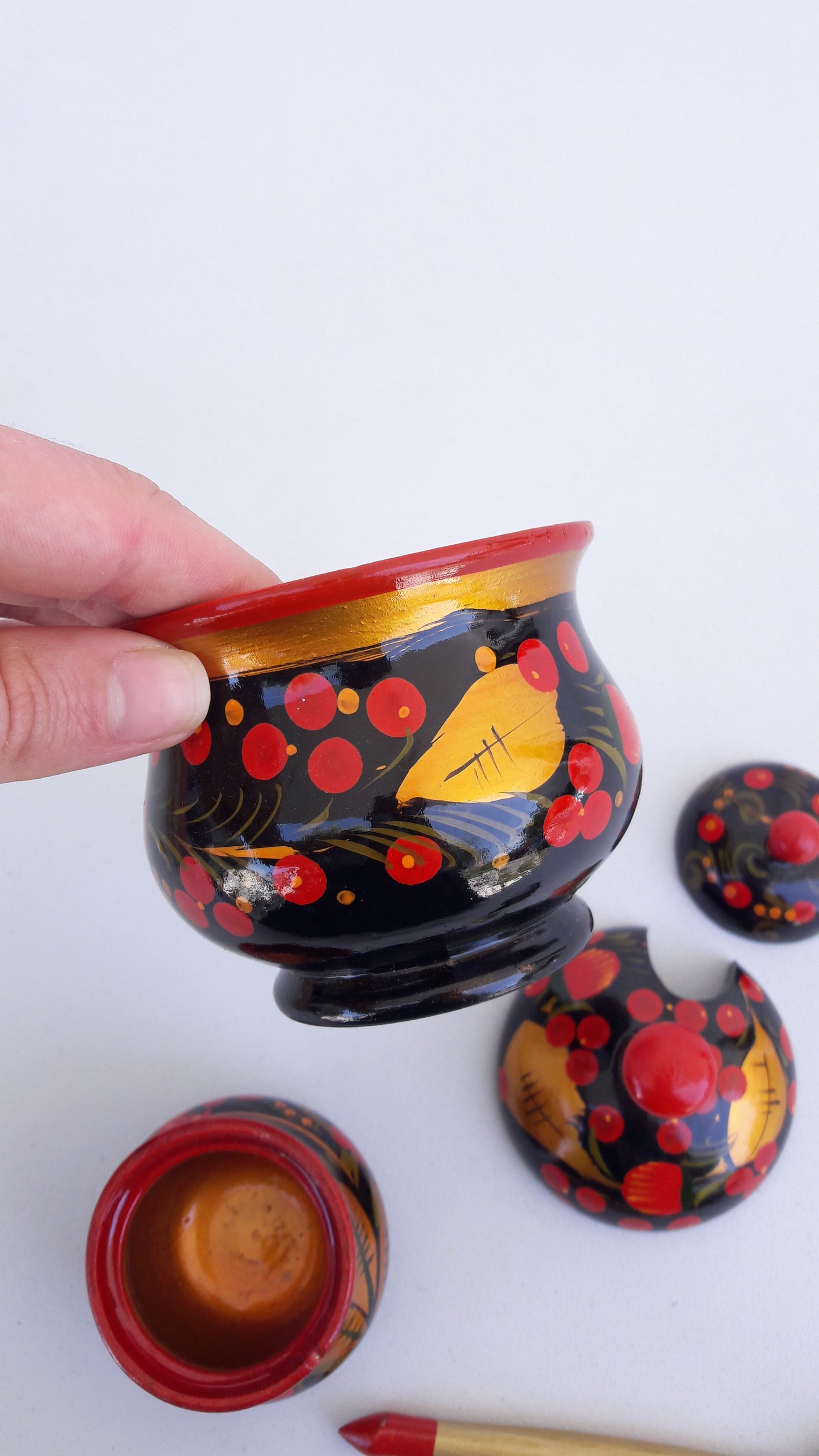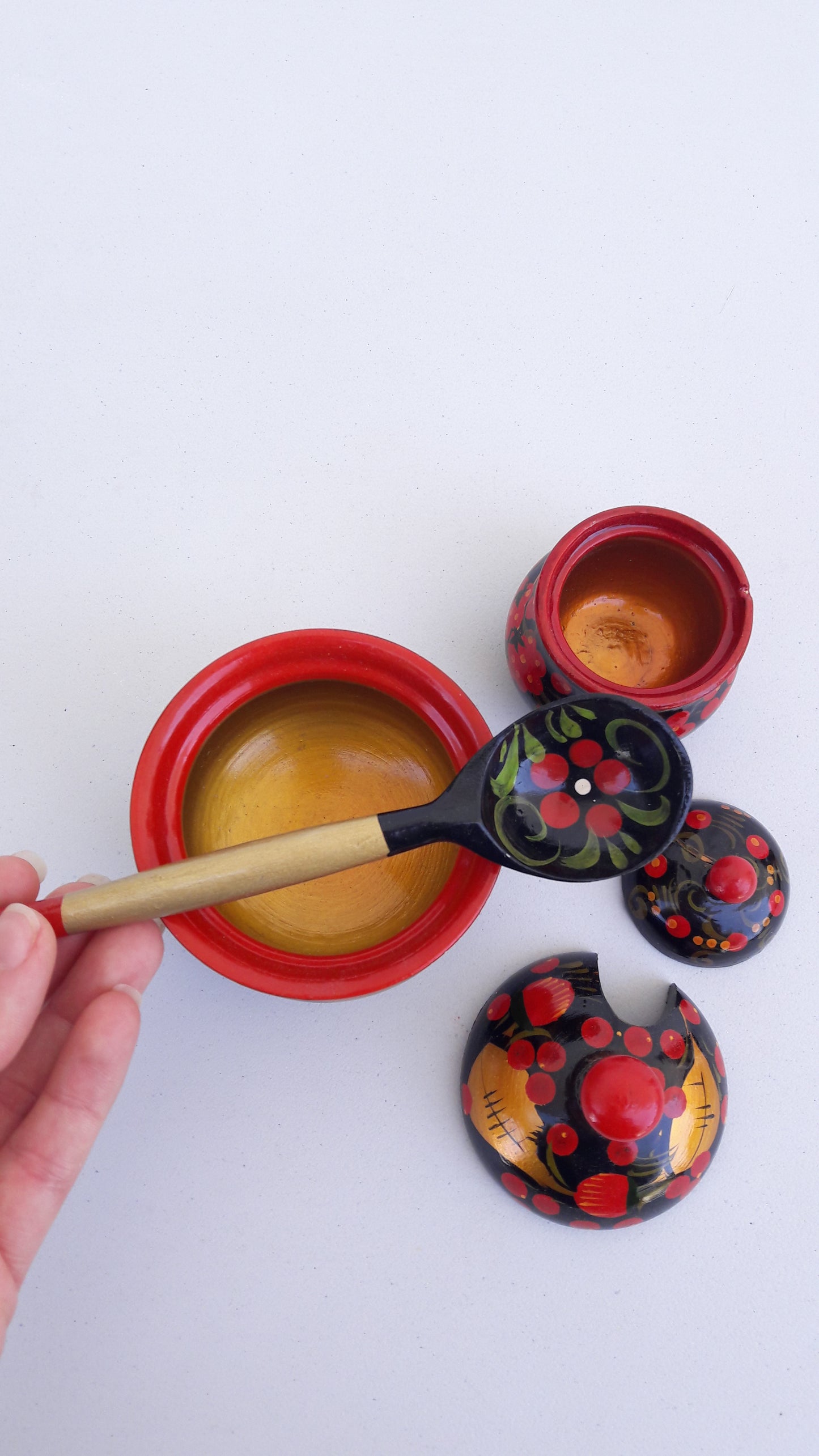 Vintage Set of Traditional Khokhloma Jars w/ Lid & Spoon